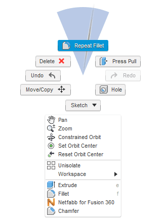 The marking menu is a situation specific popular-up menu that contains commonly used features, it can be accessed past clicking right on the model or the canvas. The features that show up in the carte du jour are determined by what is clicked and what workspace is currently agile. This carte du jour helps increase modeling speed and convenience.