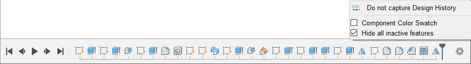 The timeline shows a history of all the operations performed to create the part. This includes all features, patterns, material changes, and sketches to name a few. This is a unique feature that allows you to see the complete history of their function without having to navigate through the browser tree. Any characteristic can be modified with a right-click within the timeline. The timeline can also exist used to detect that specific feature in the browser tree.
