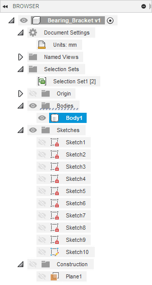 The browser contains all the components, features, bodies, sketches, and construction geometry of a blueprint. The browser takes the form a tree-like construction which should be familiar from mutual CAD packages.